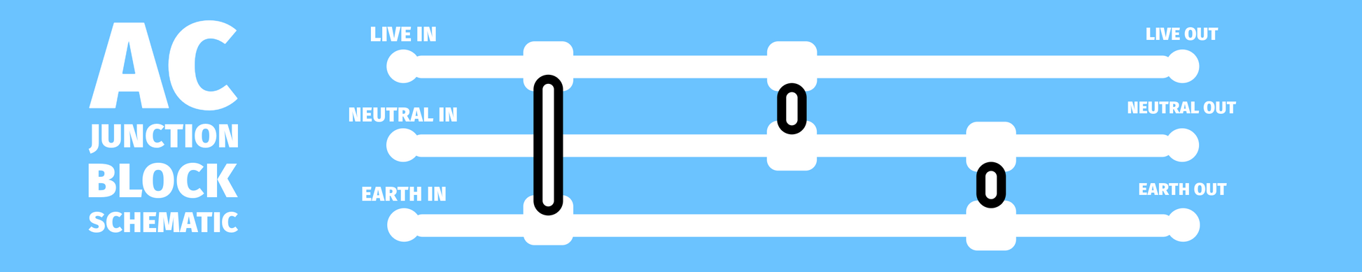 The AC Junction Block offers a screwless terminal at each end of the block each able to accept live, neutral and earth connections from 10 to 24 AWG. The AC Junction Block has three 2-terminal lever connectors which can accept through hole electronic components and wire. These central connections are connected between live-earth, live-neutral and neutral-earth allowing full flexibility on the placement of the component.